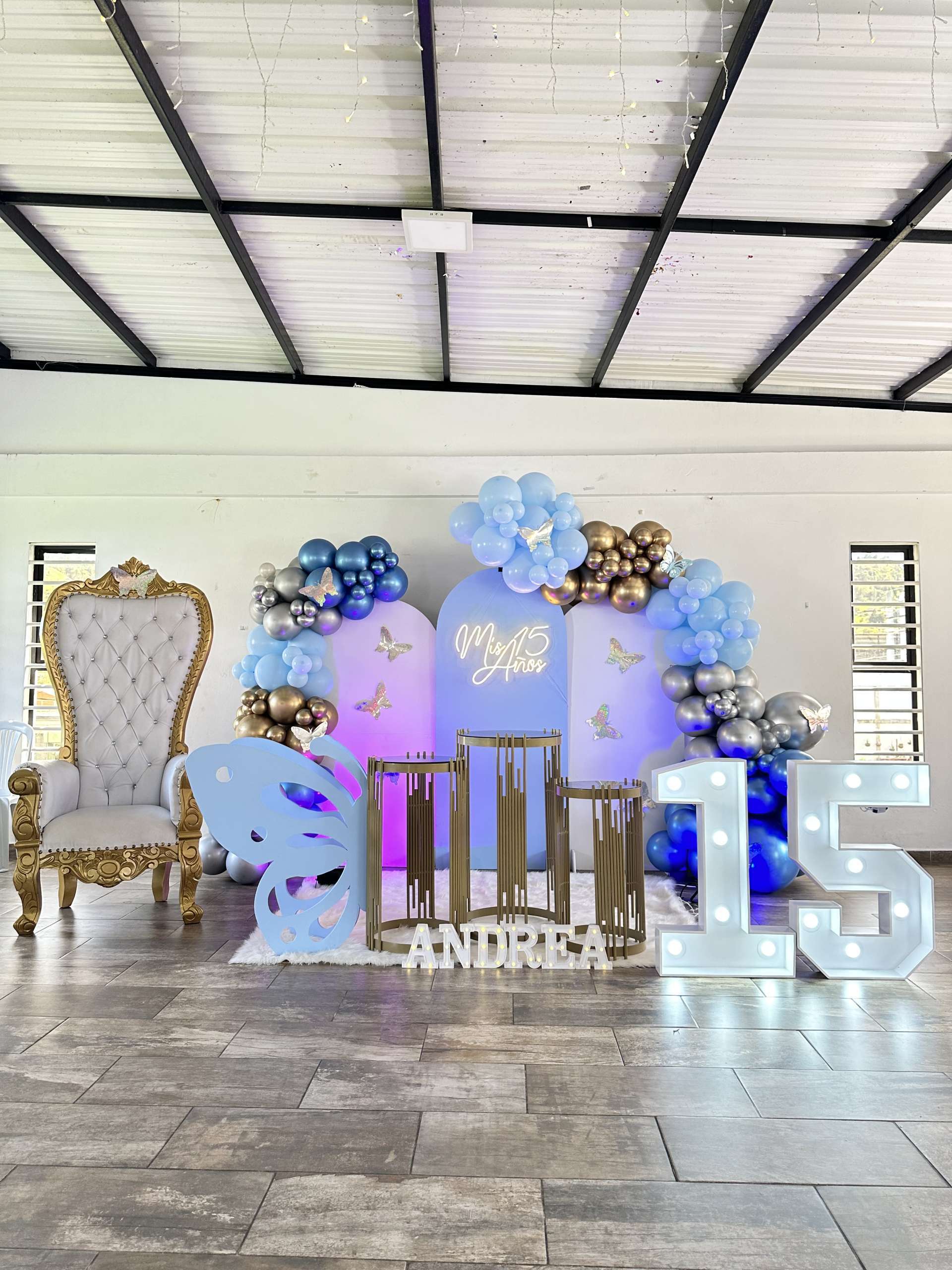 Decoración 15 años azul temática mariposa con 3 fondos disponibles en cualquier color