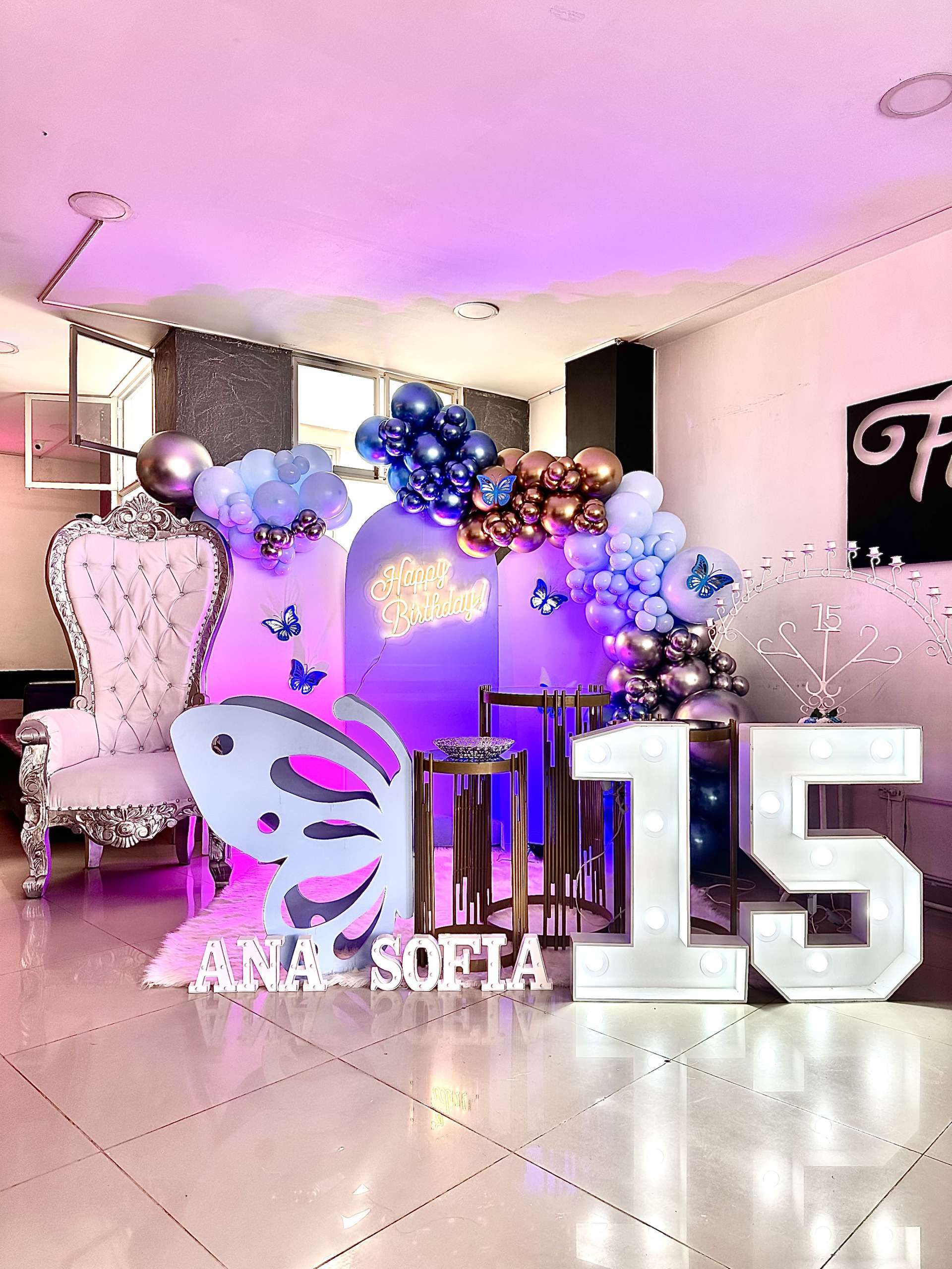 Decoración 15 años azul temática mariposa con 3 fondos disponibles en cualquier color