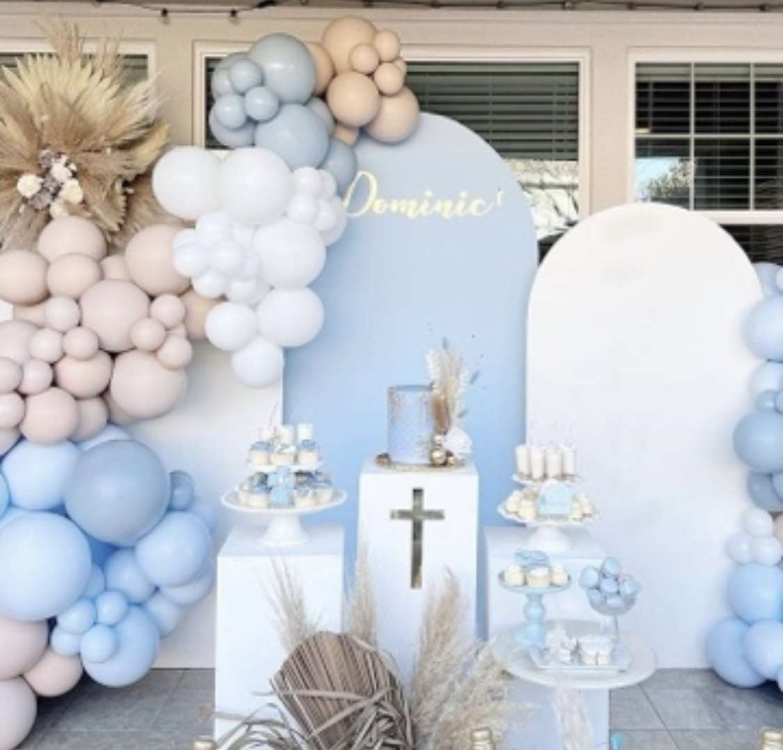 Decoración con : • 3 fondos pintados azul y blanco • cubos blancos • letrero adhesivo • globos