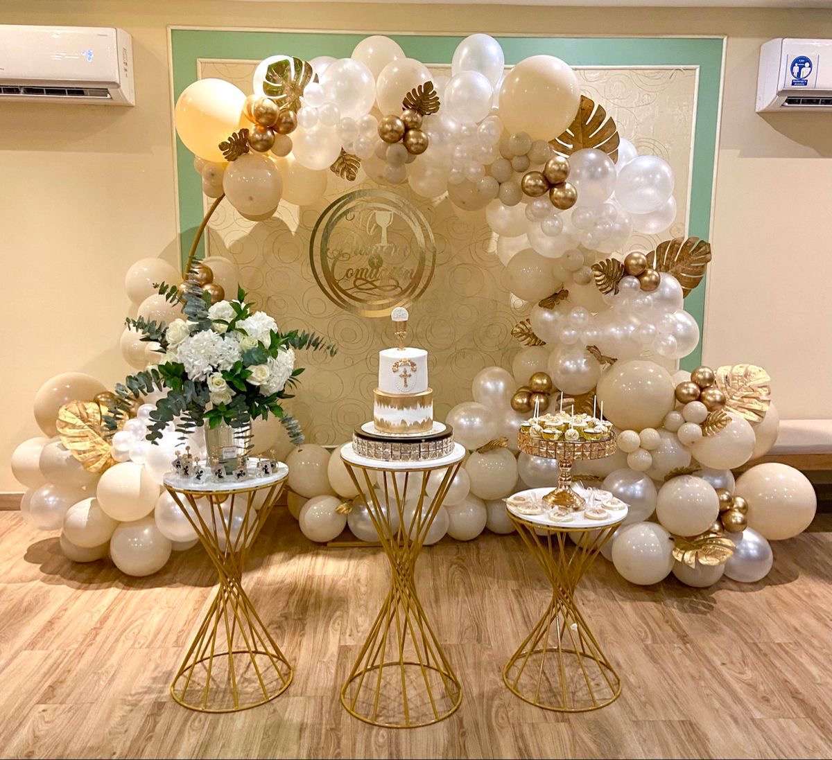 Decoración con : • aro metalico de 1’80 • letrero madera • mesas entorchadas • florero • flores